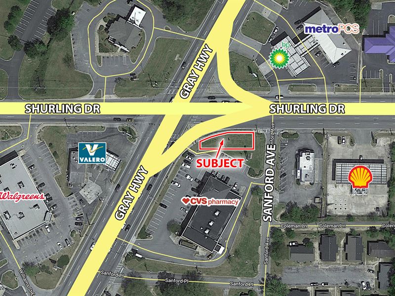 .12 AC corner lot zoned C-4. Ideal location for a billboard or ice vending machine. High traffic counts of 47,600 VPD on Gray Highway and 23,900 VPD on Shurling Drive. Owner will consider a ground lease.