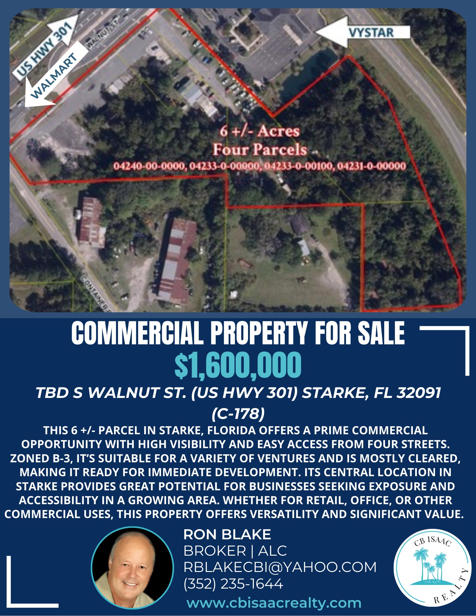 Don't miss this 6-acre +/- parcel in a high-demand location next to VyStar and directly across from Tractor Supply and Aldi Supermarket. This cleared, ready-to-develop property is zoned B-3 (City), making it perfect for various business ventures. With easy access from four streets and extensive road frontage on Starke's busiest road, this property offers unparalleled visibility and convenience. Seize this chance to establish your business in the heart of Starke's commercial district.